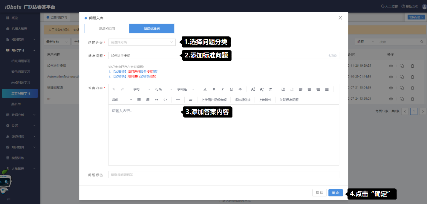 (2)若判断需要将该问题添加为新问题或其他标准问题的相似问,则需点击“问题入库”图标,在弹窗页面中进行编辑操作。