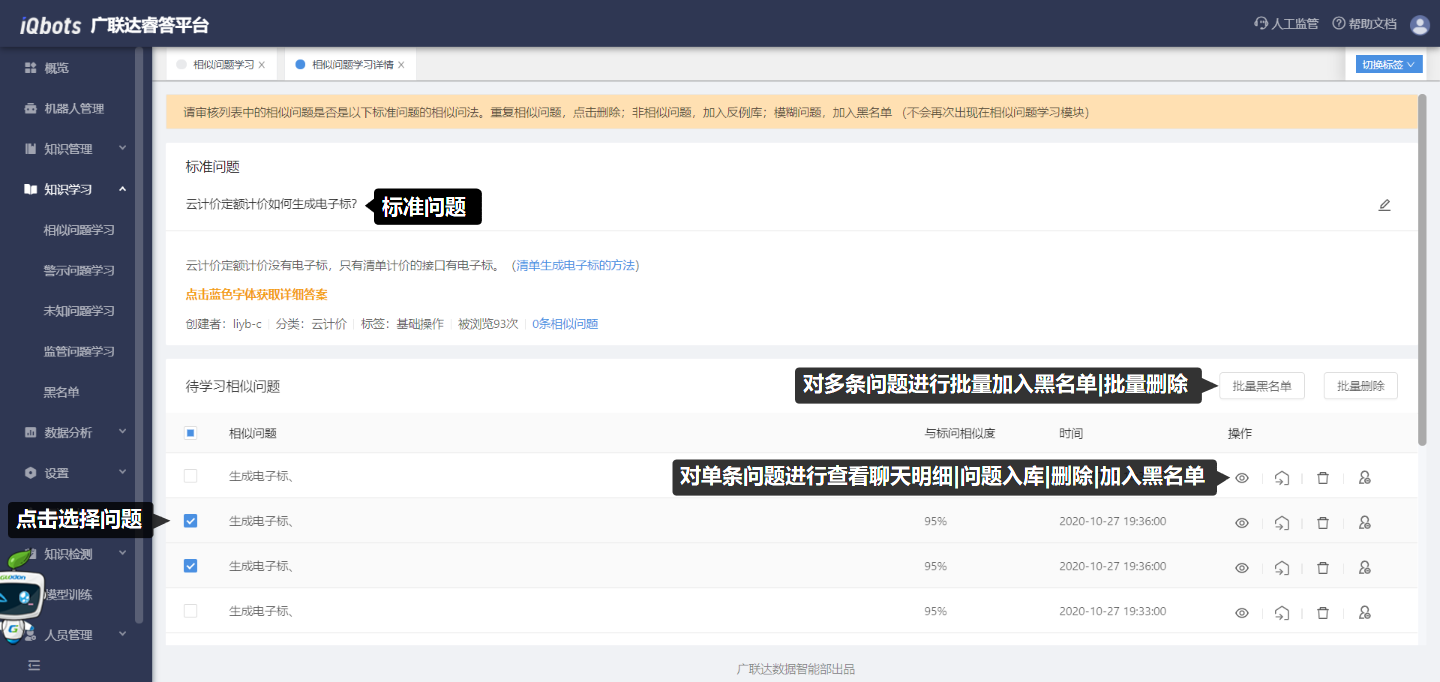 操作步骤:(1)选中分类后,点击要学习的标准问题;(2)在相似问题学习详情页面中,判断待学习相似问题列表中的问题是否属于该标准问题的相似问法,可点击查看该问法的聊天明细辅助判断;(3)根据判断结果进行相应操作(问题入库/删除数据/加入黑名单)。