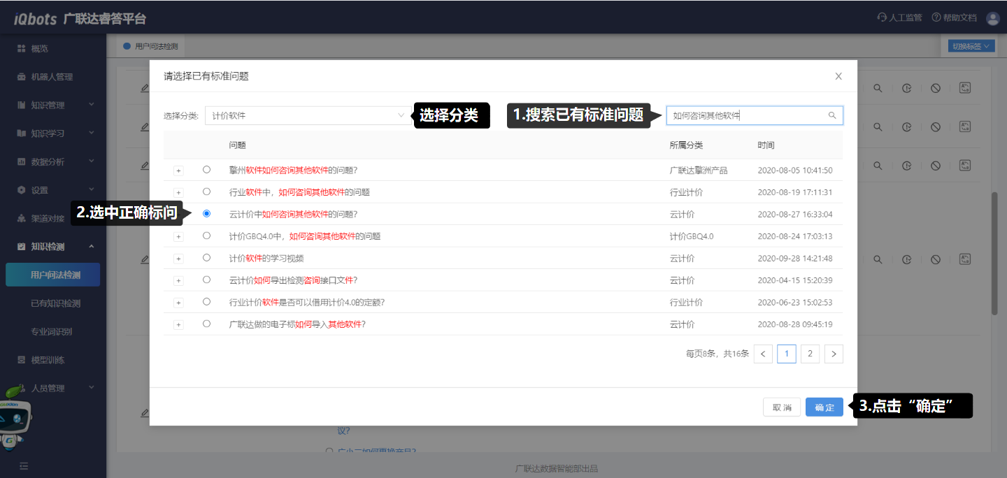 对用户问法的匹配结果进行判定:用户问法检测后,点击“匹配结果”,查看用户问法的检测结果列表;在每条问题后都可以去判定机器人回答的结果是否正确。判定类型包括:正确、正确标问、无对应标问、无效问法和模糊问法;模糊问法包括直推正确、直推错误、引导正确、引导错误四种可选的问答结果,根据机器人回复的实际情况去选择结果。