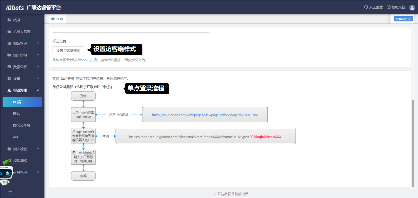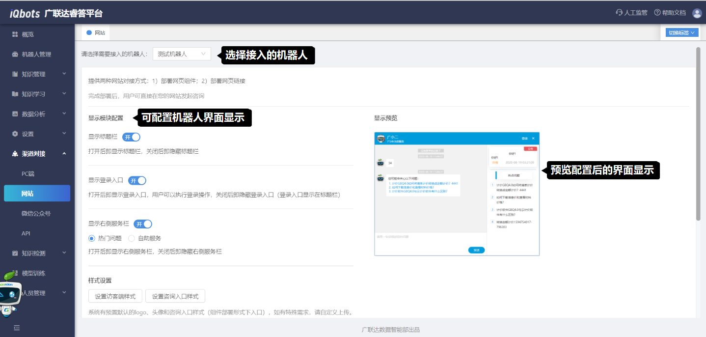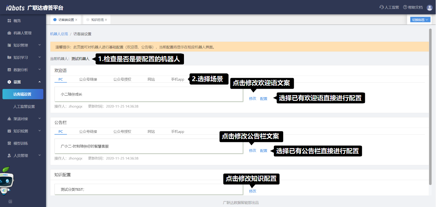 在访客端设置模块中,可以配置不同渠道下的机器人欢迎语文案、公告栏文案和对应的知识。