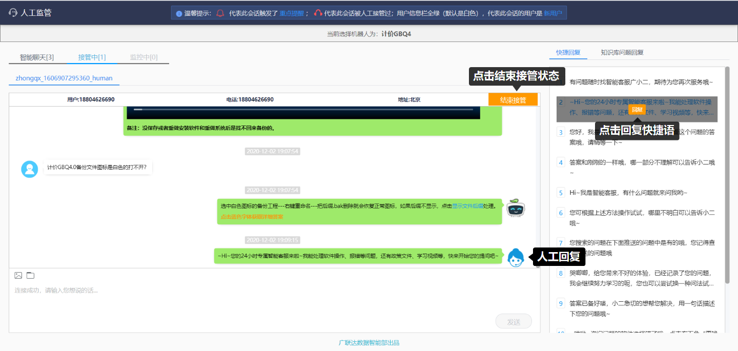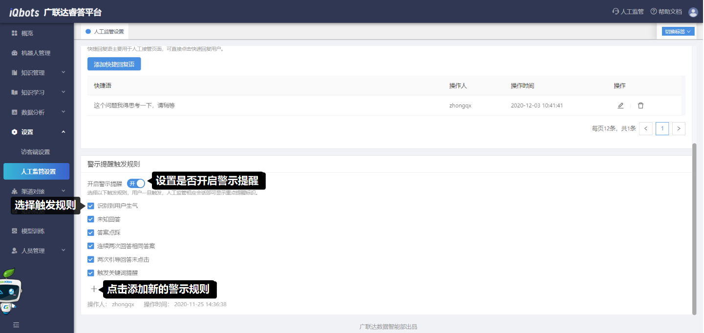 用于设置快捷回复语和警示提醒触发规则,若用户触发了设置好的警示规则,则人工监管相应会话会显示重点提醒标识;同时在人工接管页面中人工客服可以直接点击配置好的快捷回复语回复用户。