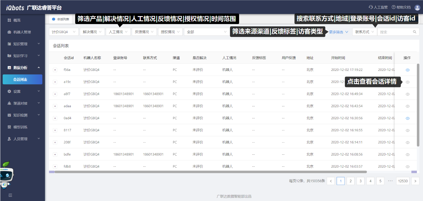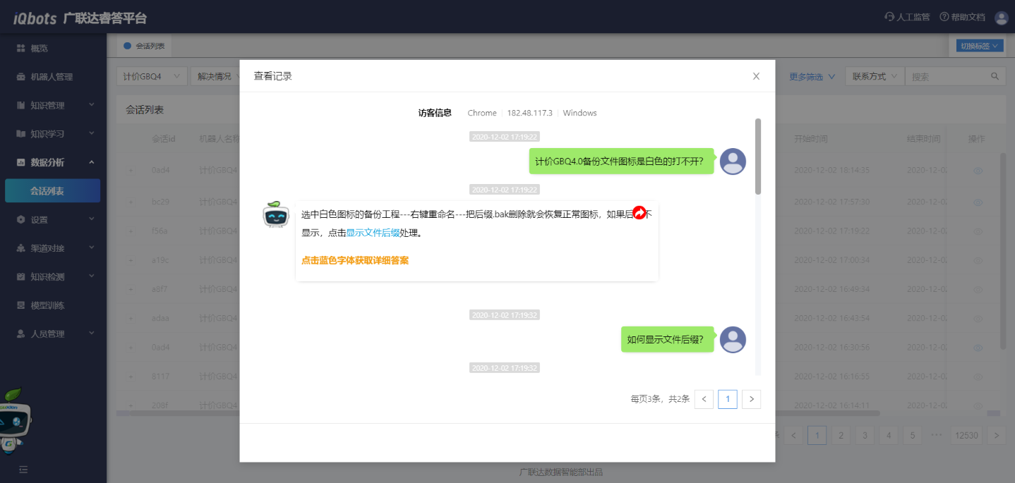 此模块主要包括会话列表,可以通过该模块了解用户状态和机器人的实际回答情况,进而制定下一步的优化方案。