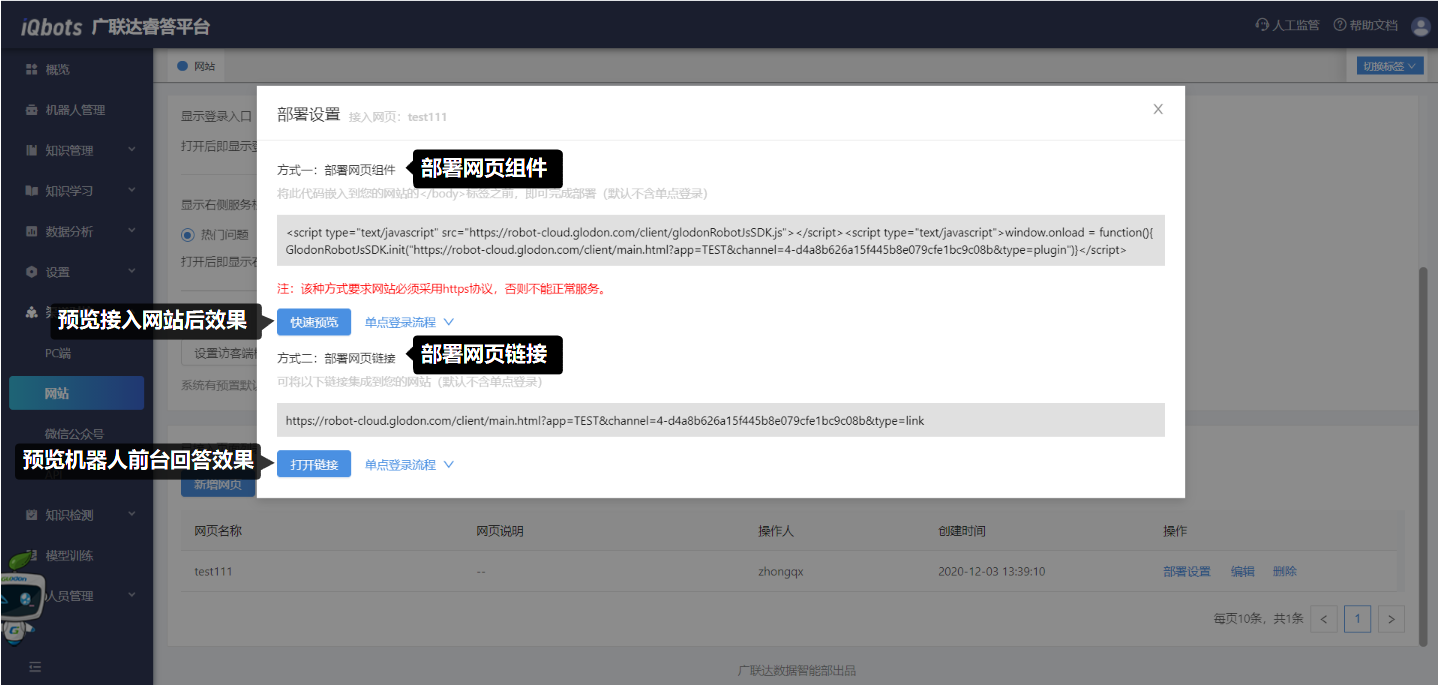 接入步骤:(1)选择需要接入的机器人;(2)点击“新增网页”,根据实际情况填写需接入的网页相关信息;(3)点击“部署设置”,按照提示选择一种部署方式即可完成对网站的部署,部署设置成功即对接成功。