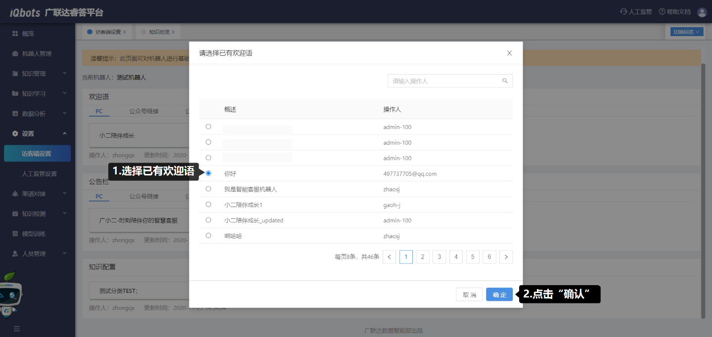 点击“设置”图标,可对当前机器人的欢迎语文案、公告栏文案、知识配置进行添加或修改。其中,欢迎语和公告栏都有两种配置方式:一种是在现有文案上进行修改;一种是选择已有欢迎语直接进行配置。