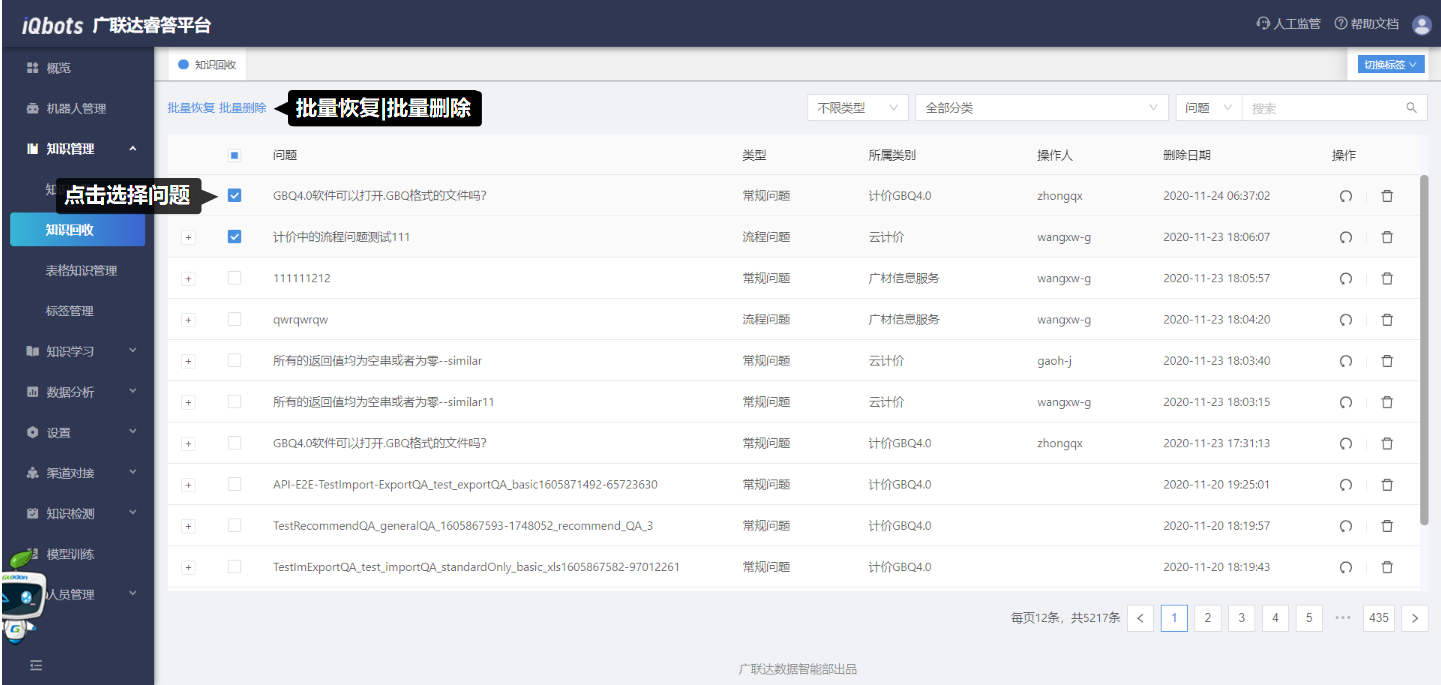 知识回收页面可实现对已删除问题的还原和删除操作。点击还原问题后,该问题会恢复为知识库内的标准问题;点击删除,该问题将被彻底删除。