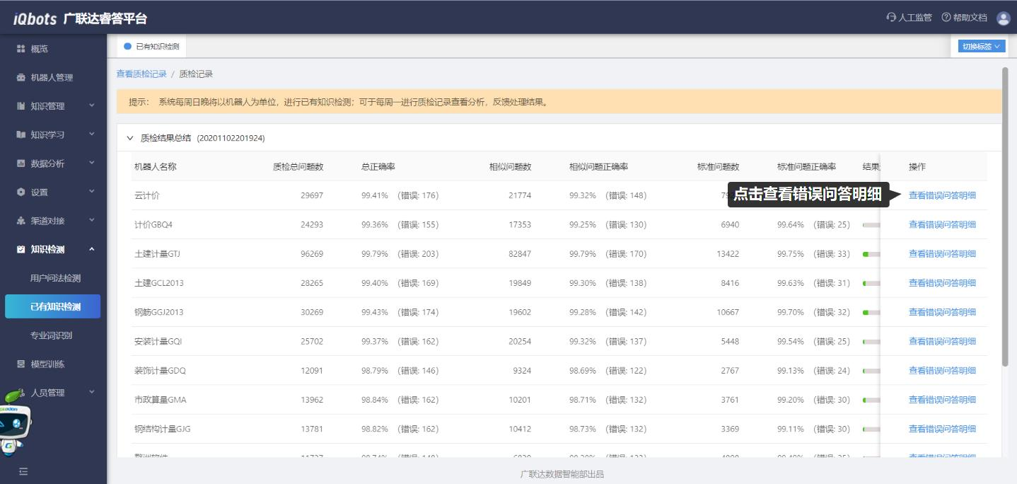 该模块是系统每周日以机器人为单位,对已有知识进行检测后的结果汇总列表。在该模块中可以查看质检的记录和详情信息,包括质检时间、状态、结果进度分析和质检详细分析结果,并在错误问题详情中反馈处理结果,如删除/合并问题。