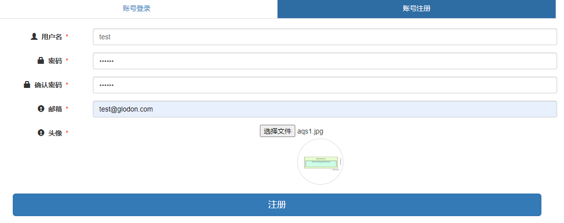 1.提供一个简单的注册页面,项目配置完毕运行后,访问该注册页面,填入用户名、密码、邮箱以及上传头像,然后注册