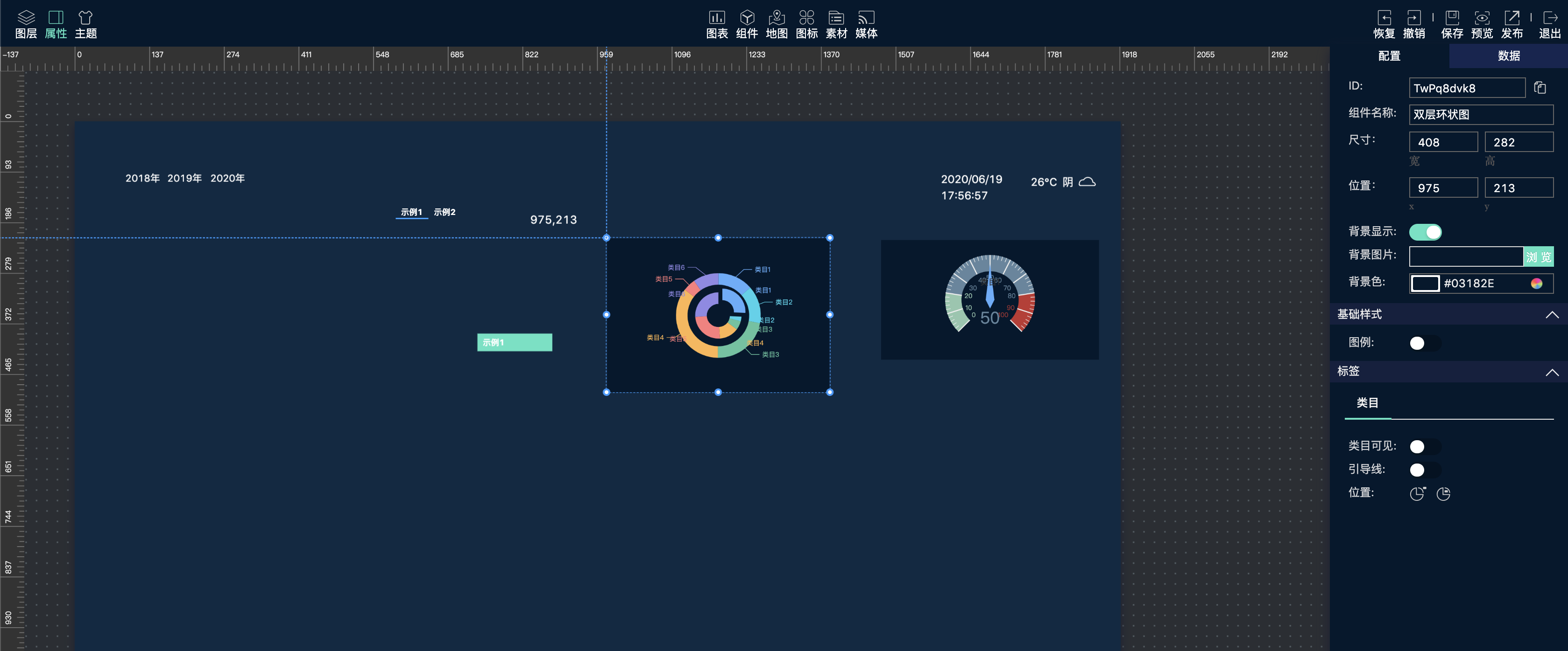- 产品采用图形化搭建工具界面,所见即所得配置方式,只需通过拖拖拽拽便可完成数据大屏建设,无需编程能力;