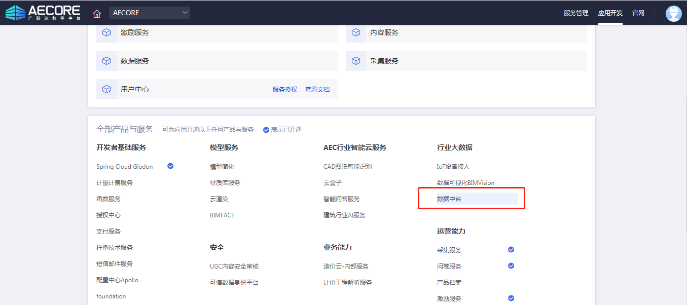 step1:登录AECORE,创建应用,开通以诚为本赢在诚信9001数据中台服务;