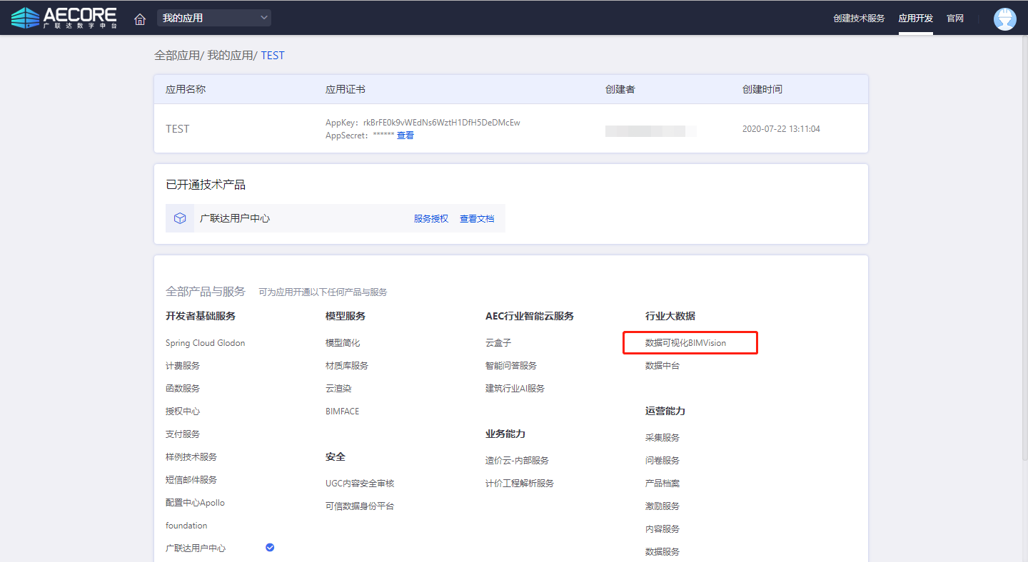 登录AECORE,并创建应用,创建应用后即可获取appkey、appsecret,这是调用服务的秘钥请妥善管理。
