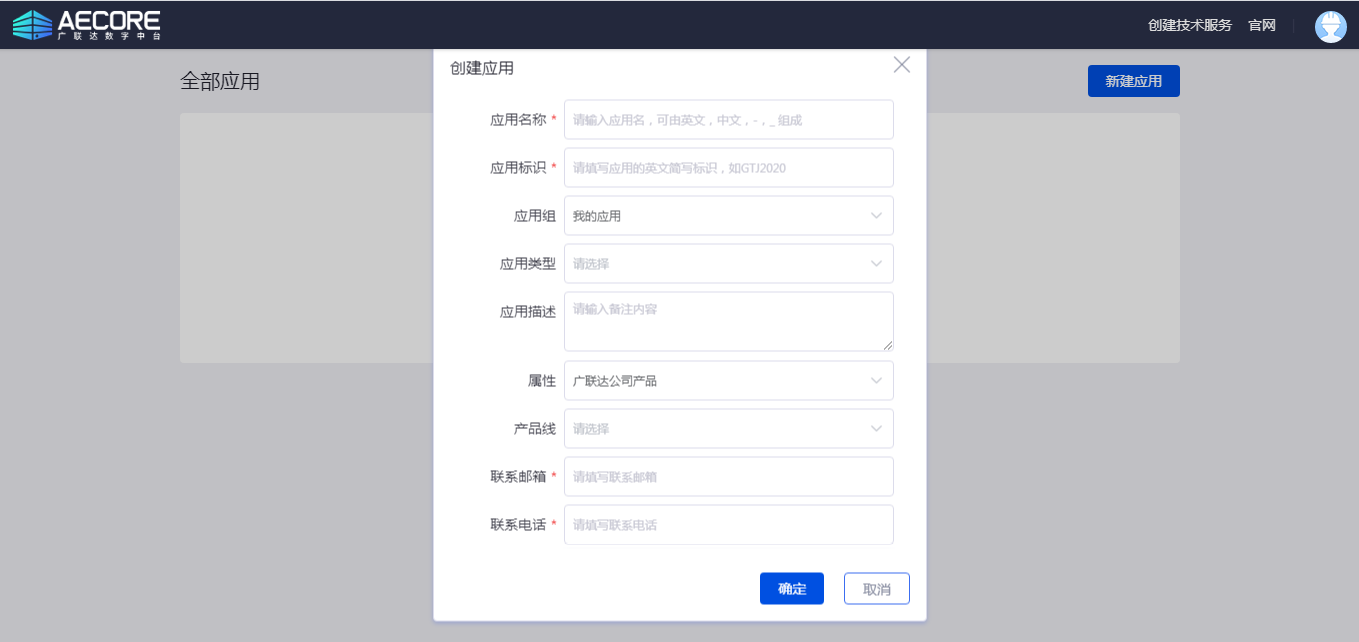 登录AECORE,并创建应用,创建应用后即可获取appkey、appsecert,这是调用服务的秘钥请妥善管理。